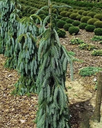 Ель Энгельмана Пендула (Picea Engelmannii Pendula) Ель с довольно узкой, компактной кроной. Плакучие, ниспадающие ветви. Хвоя длинная, серо-голубая, на ощупь она слегка бархатистая и намного более нежная, чем у Picea pungens. Размер в 10 лет 1,8 - 2 метра, ширина 0,7 метра. Хвоя серо-голубая, на ощупь она слегка бархатистая, шишки видовые. Светолюбивое растение. При посадке на плохо освещенном участке хвоя становится более темной, утрачивая свой блеск. Лучше всего для елей этого вида подойдут умеренно-влажные легкосуглинистые почвы с нейтральной кислотностью. Зимостойкая форма. Зона 3 до −40°C.