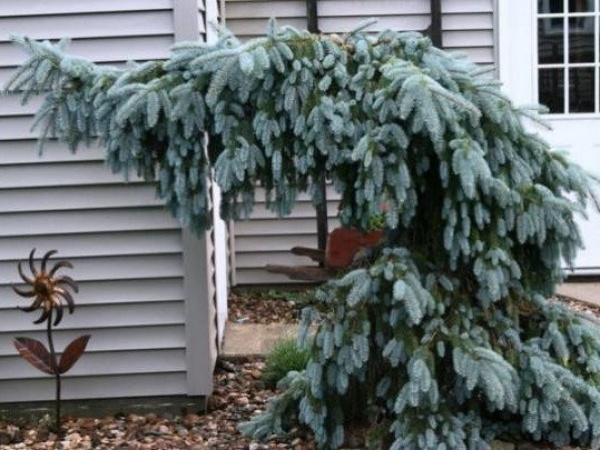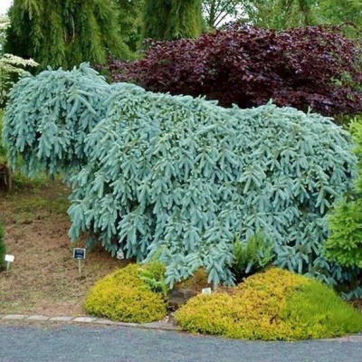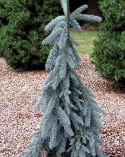 Ель колючая Блюз (Picea pungens The Blues) Ель плакучей формы с сильно опущенными ветвями. Основной побег прирастает по 15-30 см в год, пока подвязан-растет вертикально, без подвязки-изгибается и растет горизонтально. Нижние ветви практически лежат на земле. Хвоя ярко-голубая. Рекомендуется для одиночных посадок и каменистых садов. Место солнечное, почва влажная, хорошо дренированная. Высота к 10-ти годам 150-300 см. Годовой прирост: 15-30 сантиметров. При вертикальной подвязке-узкая, плакучая, среднерослая. Подходит солнечное место или полутень. Почва легкая, богатая питательными элементами почва. Лучше всего суглинок. Морозостойка и ветроустойчивая. Деревья без проблем переживают заморозки. Зона 3 до −40°C.