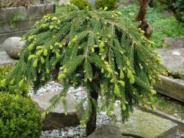 Ель обыкновенная Форманек (Picea abies Formanek) Карликовая медленно растущая форма, не имеющая центрального проводника, ветви лежачие, со временем переплетаются, образуя плотный ковер, если ветви подвязывать, то образует плакучую каскадную форму, почва любая, влажная, место солнечное, рекомендуется для небольших садов, каменистых горок. Растет чрезвычайно медленно. Годичный прирост побегов-около 5-7 см. В 10 лет диаметр кроны 0,6-0,8 м. Хвоя мелкая, имеет ярко-зеленый окрас, игольчатая, плотно растущая на ветках. Шишки маленькие, коричневого цвета. Растение теневыносливое, но лучше всего развивается на хорошо освещённых участках. Солнце, полутень, тень. Ель предпочитает влажную, хорошо дренированную почву, от слабо кислой до нейтральной. Зимостойкая форма. Зона 3 до −40°C.